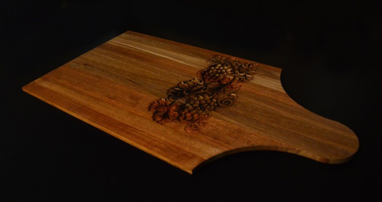 An elegant cedar and oak cutting board with custom engraving—perfect for serving guests and decorating a kitchen!