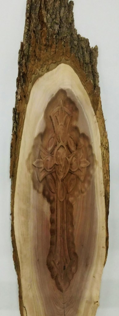 A cross of the holy Trinity in walnut. The intricate designs of any cross can be beautifully displayed when carved or engraved in wood.